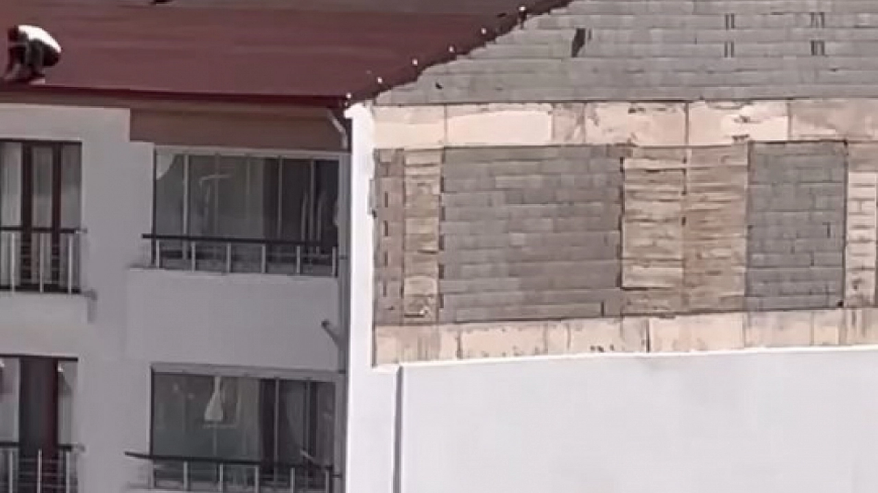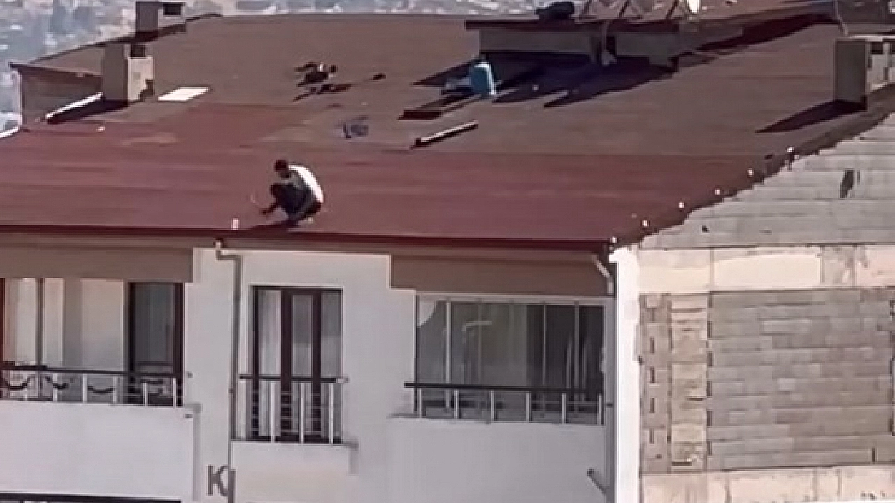 Elazığ'ın Sürsürü Mahallesi'nde işçiler, hiçbir güvenlik önlemi almadan 5 katlı bir binanın çatısında çalıştı. Vatandaşlar tarafından cep telefonu kamerasıyla kaydedilen görüntülerde, işçinin metrelerce yüksekte tedbirsiz şekilde çalıştığı görüldü. O anlar yürekleri ağza get