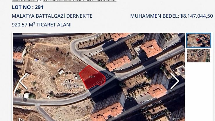 Emlak Yönetim A.Ş., 16-17 Nisan 2025 tarihlerinde 44 ilde toplam 552 muhtelif arsayı müzayede ile satışa çıkarıyor. Müzayede kapsamında Malatya'nın Battalgazi ilçesi Dernek'te bulunan 920,57 m²'lik ticari arsa da satışa sunulacak. Arsanın muhammen bedeli 8.147.044,50 TL olarak belirlendi.