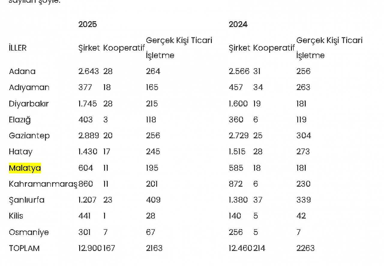 Şanlıurfa'da geçen yıl 1207, Diyarbakır'da 1745 yeni şirket açılırken Malatya'da 604 şirket faaliyete başladı.Aynı dönemde Kilis'te kurulan şirket sayısı 441, Elazığ'da kurulan ise 403 olarak kayıtlara geçti. En az şirket kurulan iller ise 377 ile Adıyaman ve 301 ile Osmaniye olarak belirlendi. Depremin etkilediği 11 ilin 7'sinde 2025'te kurulan şirket sayısında bir önceki yıla göre artış, 4'ünde azalış kayıtlara geçti.