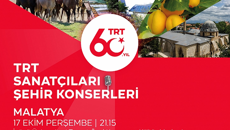 TRT'nin 60. yıl kutlamaları çerçevesinde düzenlenen 'TRT Sanatçıları Şehir Konserleri' serisi, 17 Ekim'de Malatya'da gerçekleşecek. Türk Halk ve Sanat Müziği'nin seçkin sanatçıları, Malatyalılara unutulmaz bir akşam yaşatacak.