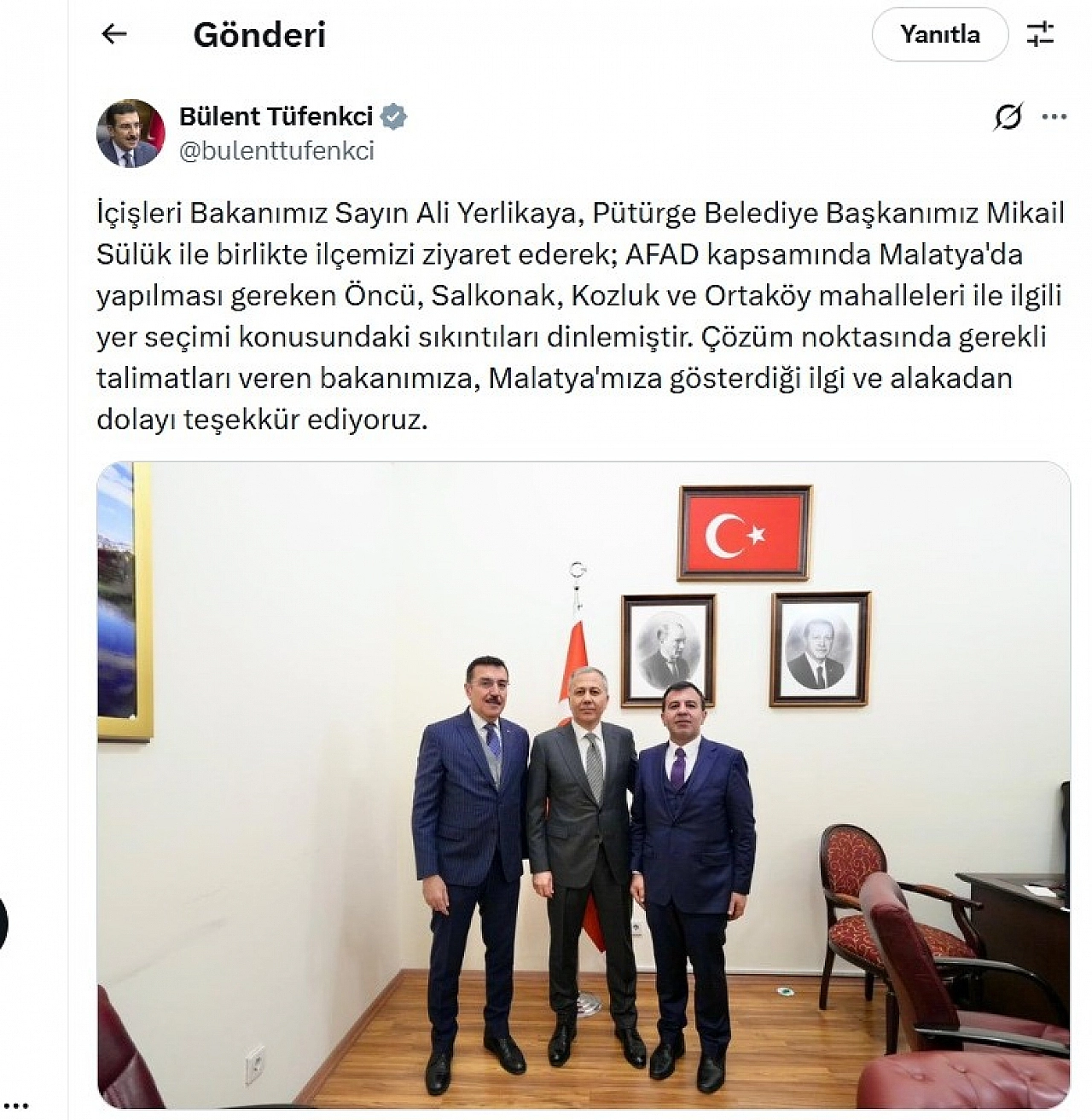 Tüfenkçi, bugün sosyal medya hesabından yaptığı paylaşımda şu ifadeleri kullanmıştı: “İçişleri Bakanımız Sayın Ali Yerlikaya, Pütürge Belediye Başkanımız Mikail Sülük ile birlikte ilçemizi ziyaret ederek; AFAD kapsamında Malatya'da yapılması gereken Öncü, Salkonak, Kozluk ve Ortaköy mahalleleri ile ilgili yer seçimi konusundaki sıkıntıları dinlemiştir. Çözüm noktasında gerekli talimatları veren bakanımıza, Malatya'mıza gösterdiği ilgi ve alakadan dolayı teşekkür ediyoruz.”
