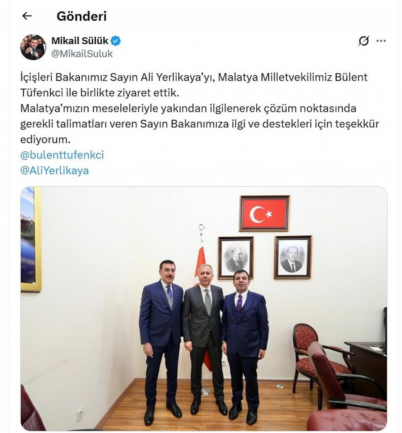 Oysa gerçek bambaşkaydı. Aynı ziyarete katılan Pütürge Belediye Başkanı Mikail Sülük, dürüstçe şu paylaşımı yaptı:“İçişleri Bakanımız Sayın Ali Yerlikaya'yı, Malatya Milletvekilimiz Bülent Tüfenkci ile birlikte ziyaret ettik. Malatya'mızın meseleleriyle yakından ilgilenerek çözüm noktasında gerekli talimatları veren Sayın Bakanımıza ilgi ve destekleri için teşekkür ediyorum.”