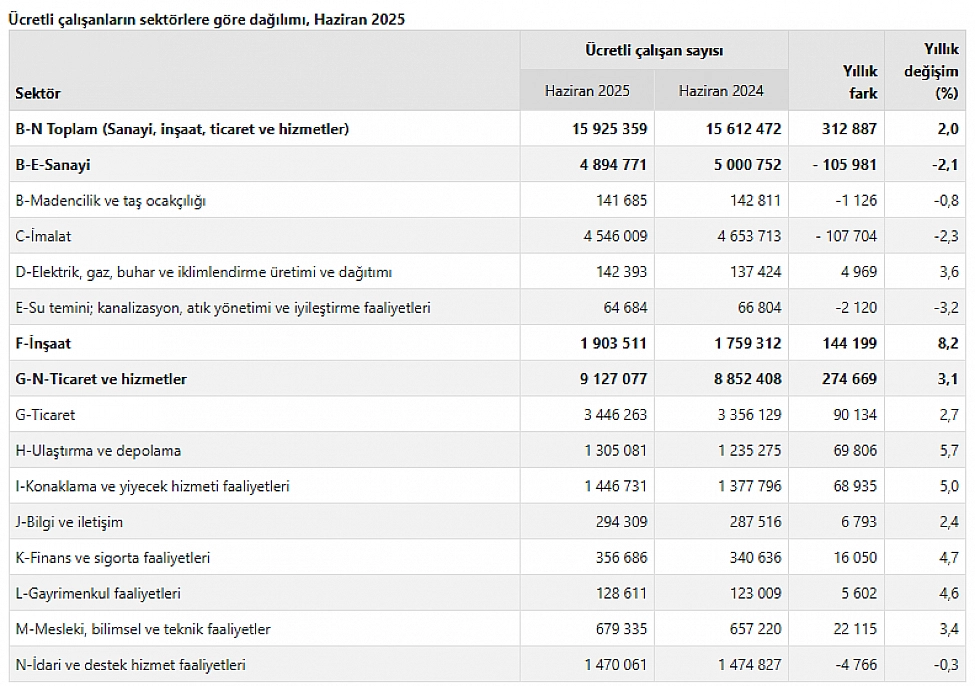 Türkiye İstatistik Kurumu (TÜİK), 2025 yılı Haziran ayına ilişkin Ücretli Çalışan İstatistiklerini yayımladı. Buna göre, ücretli çalışan sayısı 2025 yılı Haziran ayında geçen yılın aynı ayına göre yüzde 2 artarak 15,9 milyona ulaştı. Aylık bazda ise istihdamda herhangi bir değişim yaşanmadı.