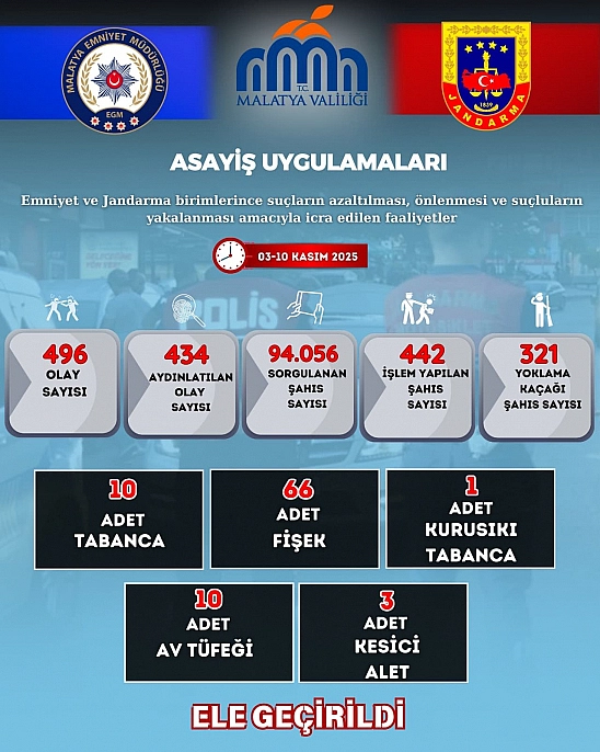 Malatya Valiliği, Emniyet ve Jandarma birimlerinin 03- 10 Kasım tarihleri arasındaki bir haftalık güvenlik operasyonlarının verilerini duyurdu. Raporda, asayiş uygulamalarında 94 bin 056 kişinin sorgulandığı ve 496 olayın 434'ünün aydınlatıldığı belirtildi.