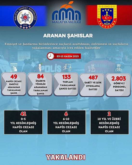 Malatya Valiliği, Emniyet ve Jandarma birimlerinin 03- 10 Kasım tarihleri arasındaki bir haftalık güvenlik operasyonlarının verilerini duyurdu. Raporda, asayiş uygulamalarında 94 bin 056 kişinin sorgulandığı ve 496 olayın 434'ünün aydınlatıldığı belirtildi.