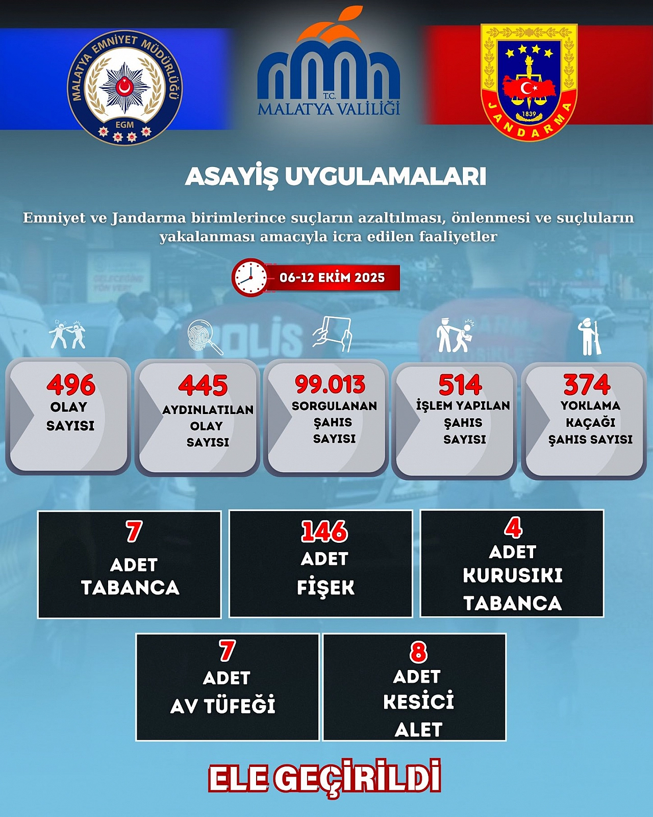 Asayiş birimlerinin uygulamalarında da önemli sonuçlar alındı. Bir hafta içerisinde meydana gelen 496 asayiş olayının 445'i başarıyla aydınlatıldı. Uygulamalar kapsamında 99 bin 13 şahıs sorgulanırken, haklarında işlem yapılan şahıs sayısı 514 oldu. Denetimlerde ayrıca 374 yoklama kaçağı tespit edilerek gerekli işlemler yapıldı. Uygulamalarda ele geçirilen suç unsurları arasında 7 tabanca, 4 kurusıkı tabanca, 7 av tüfeği, 8 kesici alet ve 146 adet fişek bulunuyor.