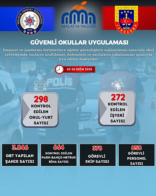 Malatya Valiliği, Emniyet ve Jandarma birimlerinin 20-26 Ekim tarihleri arasındaki bir haftalık güvenlik operasyonlarının verilerini duyurdu. Raporda, Asayiş uygulamalarında 95 bin 602 kişinin sorgulandığı ve 418 olayın 356'sının aydınlatıldığı belirtildi.
