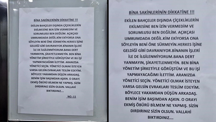 Bina sakinlerinin dikkatine. Ekilen bahçeler dışında çiçekliklerin ekilmesine ben izin vermedim ve sorumlusu ben değilim. Açıkçası umrumda da değil. Kim ekiyorsa ona söyleyin beni öne sürmeyin. Herkes işine geldiği gibi davranıyor. Binanın işleri ile de ilgilenmiyorum. bana dert yanmayın, şikayet etmeyin. Ben bina yönetim şirketiyle görüştüm ve bu işi yapmayacağımı ilettim. Aranızda yönetici seçin. Yönetici olmak isteyen varsa gelsin evrakları teslim edeyim. Böylece yakamdan düşün arkadaş. Benim işim başımdan aşkın. O orayı ekmiş öbürü bilmem ne yapmış. Sizin dırdırınız sizin olsun. Vallahi bıktırdınız.