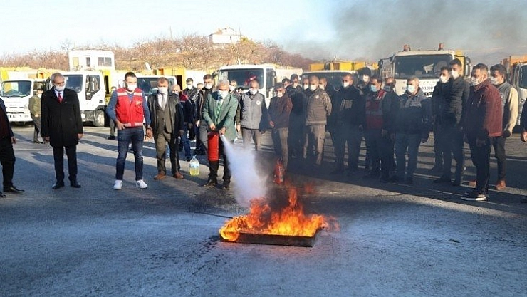 Malatya Battalgazi Belediyesi Temizlik İşleri Müdürlüğü tarafından temizlik personeline yangın söndürme, kurtarma, tahliye ve ilk yardım konularını içeren 'Yangın eğitimi ve yangın söndürme tatbikatı' yapıldı.