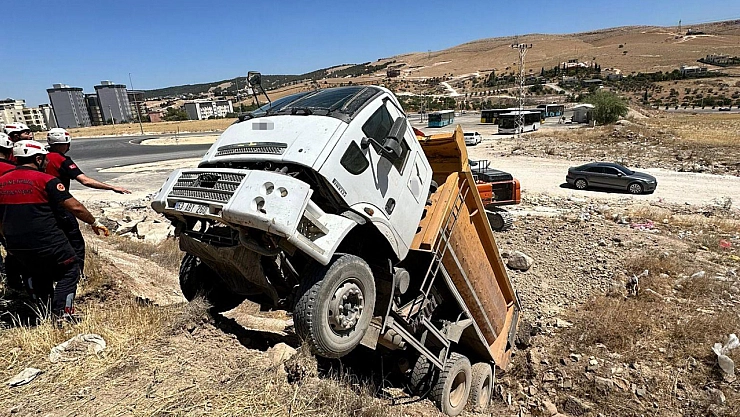 Şanlıurfa'da kontrolden çıkarak şarampole devrilen kamyonun sürücüsü itfaiye tarafından kepçenin geniş kovasına konularak kurtarıldı.