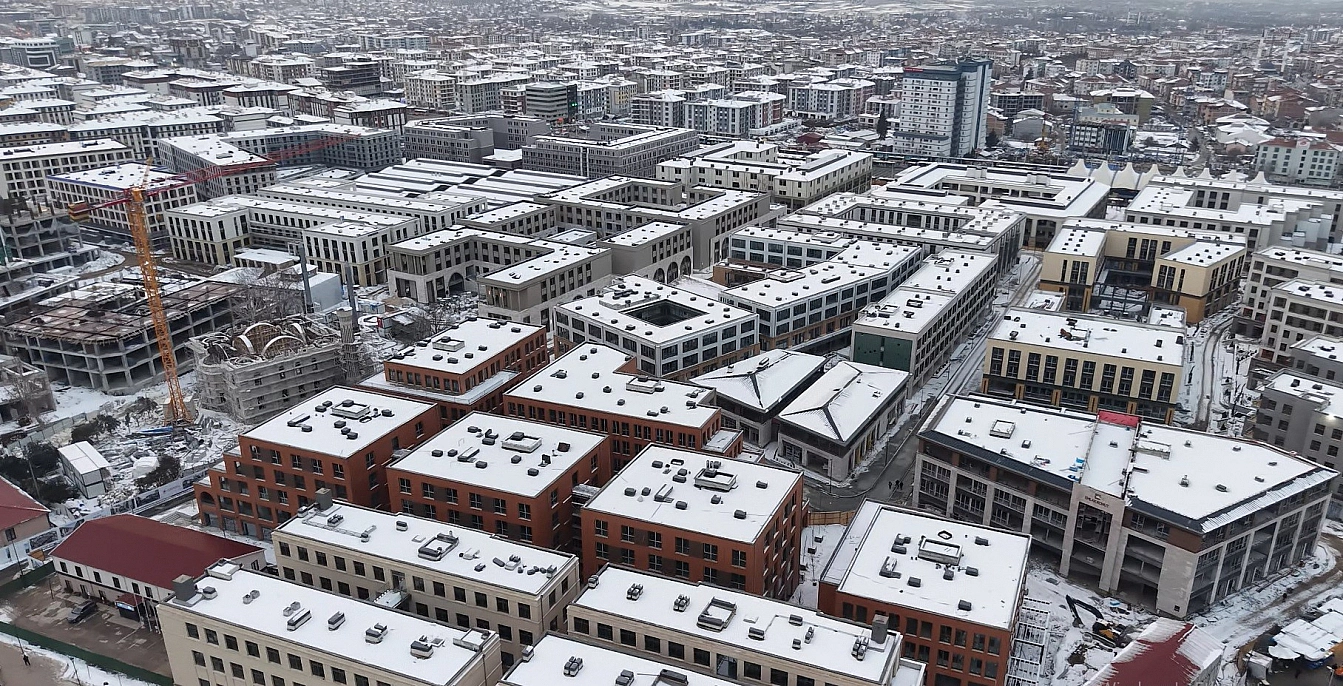 6 Şubat depremlerinde tamamen yıkılan Malatya çarşısının yerine inşa edilen yeni çarşı merkezi, etkili olan kar yağışıyla beyaza büründü. Gün batımında drone ile kaydedilen görüntülerde kartpostallık manzaralar ortaya çıktı.