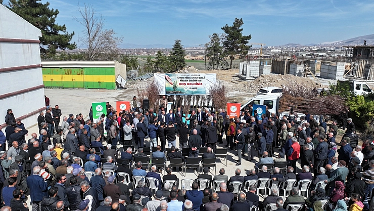 Törende, 25 bin adet kayısı fidanını Yeşilyurt Belediyesi’ne hibe eden Özgüven Grup sahibi Eşref Kalan’a teşekkür plâketi takdim edilirken, çiftçilere meyve fidanları tek tek teslim edildi.