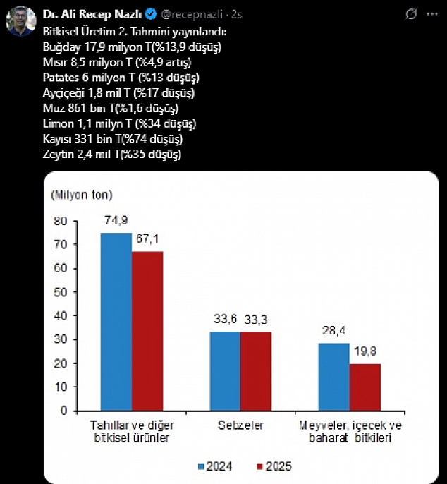 Türkiye İstatistik Kurumu (TÜİK), 2025 Bitkisel Üretim 2. Tahmini verilerini paylaştı. Paylaşılan verilere göre, Nisan ayında yaşanan zirai don nedeniyle kayısıda 331 bin tonluk kayıp meydana geldiğini yayınladı.